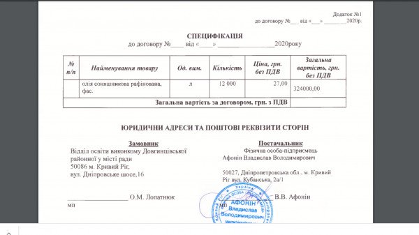 В 2020 году Долгинцевский отдел образования сэкономил 132 тысячи гривен из бюджета, закупив у ФЛП «Коваленко Валентина Дмитриевна» подсолнечное масло по 23 гривны за литр.