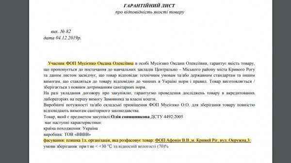 «И после этого возникает еще один вопрос, не тот самый ФЛП Афонин В.В. будет разливать масло для Центрально-Городского района, который предлагал в Долгинцевском районе Кривого Рога масло по 27 гривен за литр? Изучив внимательно документы, мы выяснили, что он», — рассказывают общественники.