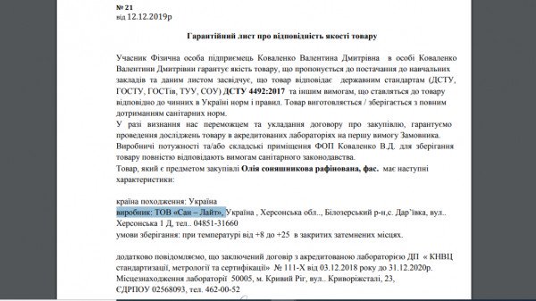 «Конечно важным фактором при закупке любых продуктов питания является качество. И первое, что приходит в голову, то что по 23 гривны будут поставлять некачественное масло. Но это не так, потому что Валентина Дмитриевна Коваленко в документах указала производителя ООО «Сан — Лайт», которое производит масло под торговой маркой «Добра олія». Масло этой же фирмы, поставляли осенью (другим поставщиком) в школы Покровского района города по 38 гривен 21 копейке за литр. Поэтому к качеству масла претензий быть не может», — пишут члены общественной организации «Основи свідомості».