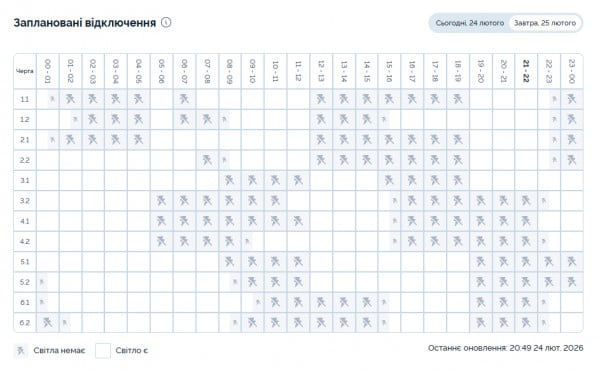 График отключений света от ДТЭК на 25 февраля: