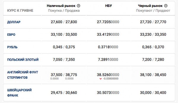 А на черном рынке курс гривны к популярным иностранным валютам составляет: