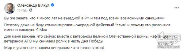 Олександр Вілкул назвав на свой сторінці у соцмережі публікацію аудіо «фейковим «зливом».