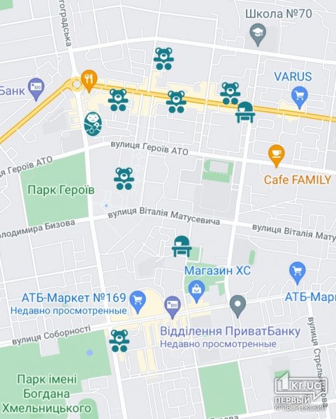 На мапі вказані місця, доступні і зручні для маломобільних категорій: вказано, де є пандуси, пеленальні столики або зони для дітей.