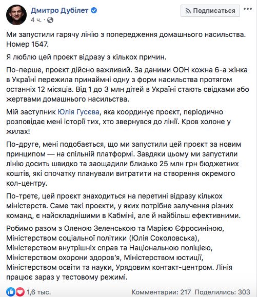 «Проект действительно важен. По данным ООН каждый шестой женщина в Украине пережила по крайней мере одну из форм насилия в течение последних 12 месяцев. От 1 до 3 миллионов детей в Украине становятся свидетелями или жертвами домашнего насилия», — написал Дмитрий Дубилет.